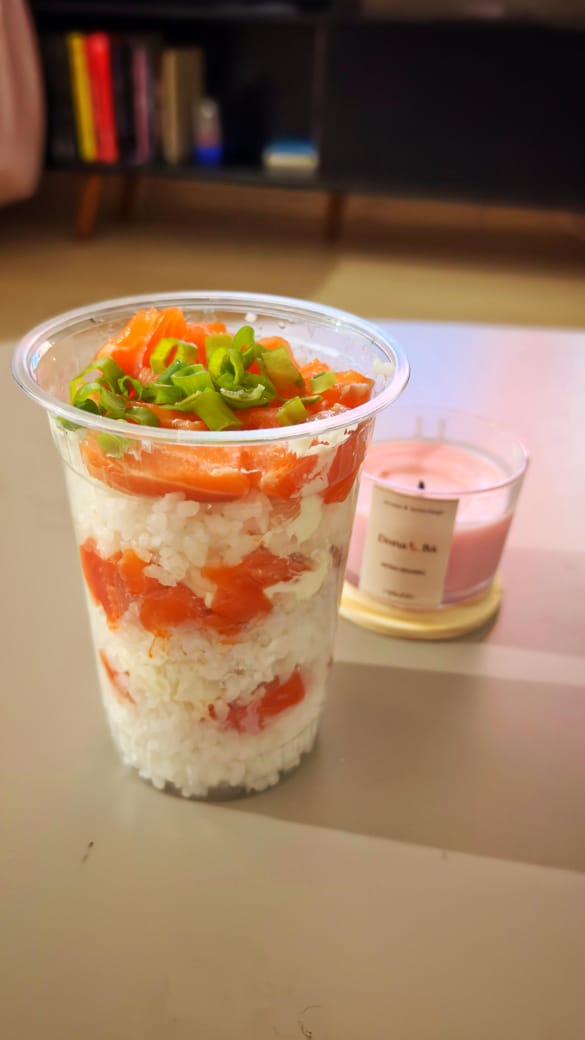 Delicioso sushi no copo com salmão com a opção de receber grelhado e cream cheese, perfeito para uma refeição prática e saborosa.