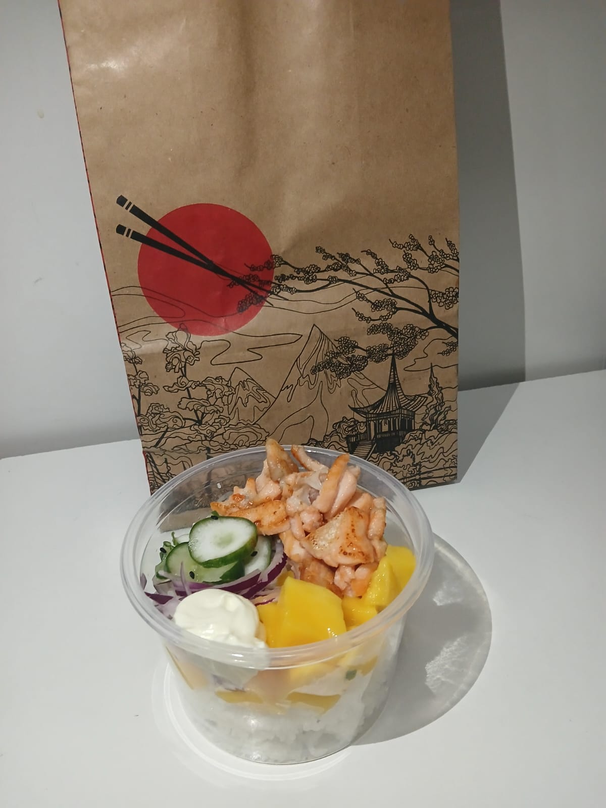 Poke de salmão, com opção de recebê-lo grelhado, com sunomono, manga, cebola e cream cheese, uma opção refrescante e nutritiva.